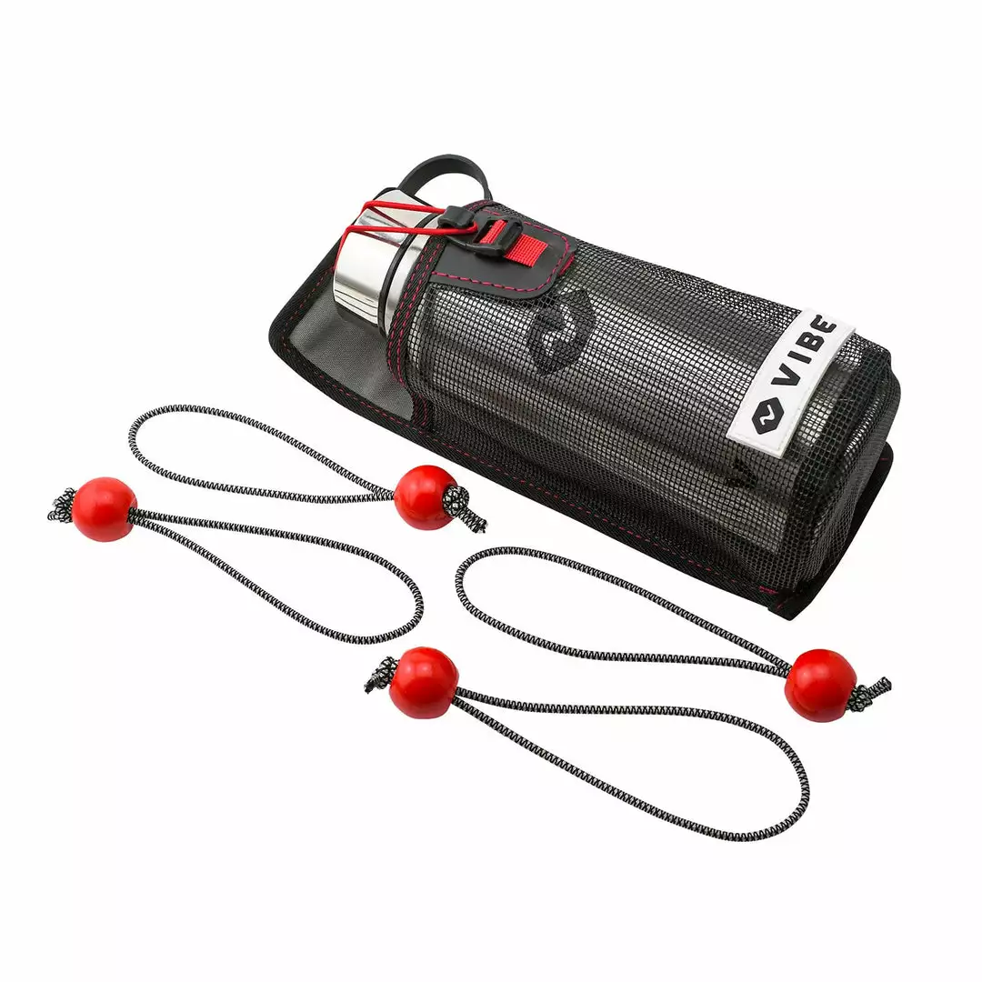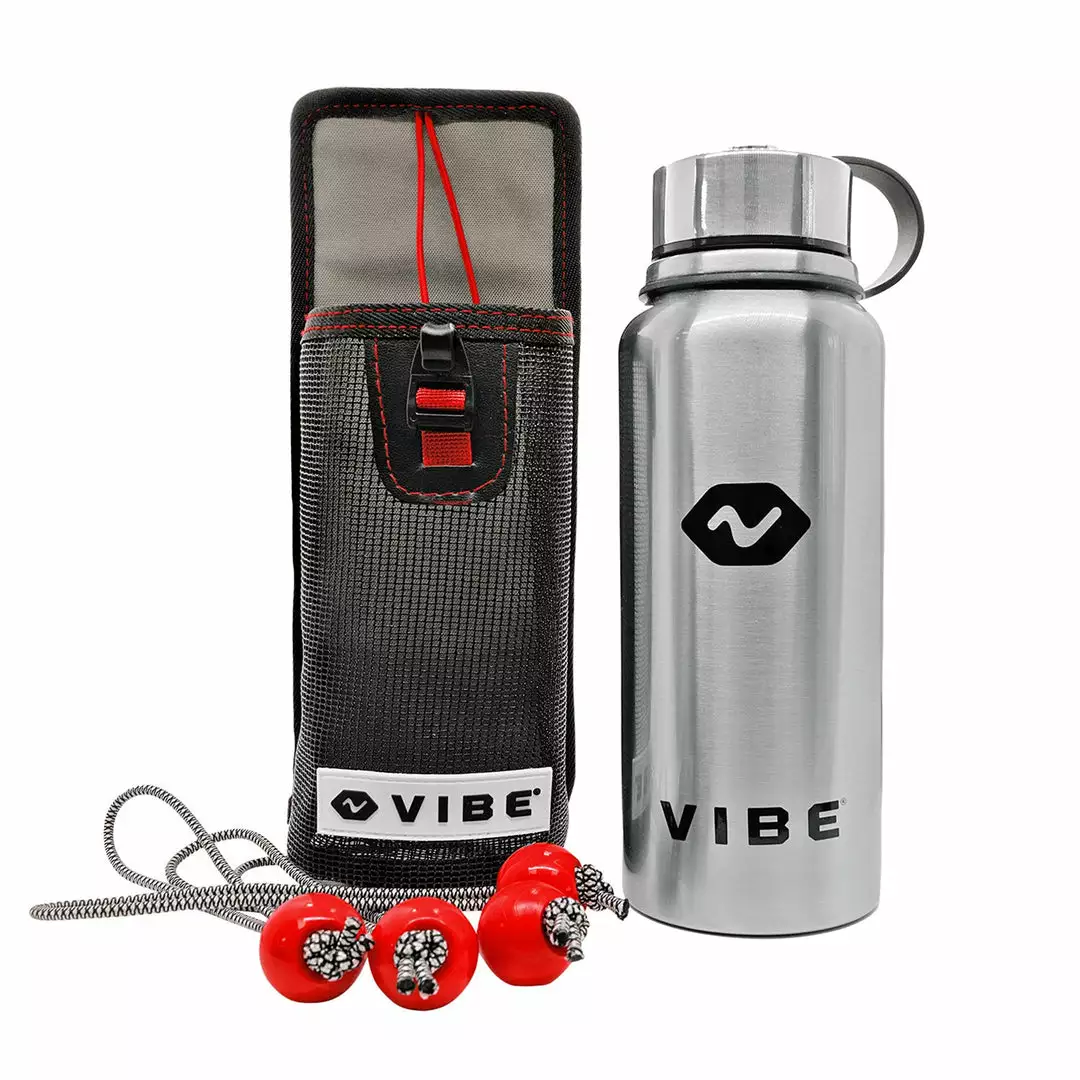 Vibe Mesh Bottle Holder w/double wall stainless-steel water bottle easily attaches anywhere using its bungee-lashing-ball, fits any standard bottle, and shrugs off Mother Nature’s moods.